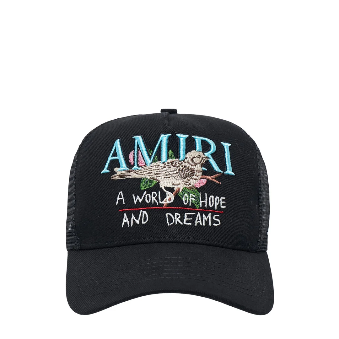 600081755BLK0OS / AMSAHE1034/00/001 - Embroidered dove and rose motif - Mesh back panels for breathability - Structured cotton twill construction - Adjustable snapback closure - Curved visor - Classic trucker hat silhouette The AMIRI World of Hopes Dreams Trucker delivers luxury streetwear with artistic embroidery and premium construction. Crafted from structured cotton twill in classic black with mesh back panels, featuring intricate dove and rose embroidery across the crown. The signature AMIRI aesthetic combines California street culture with high-end craftsmanship for contemporary luxury.