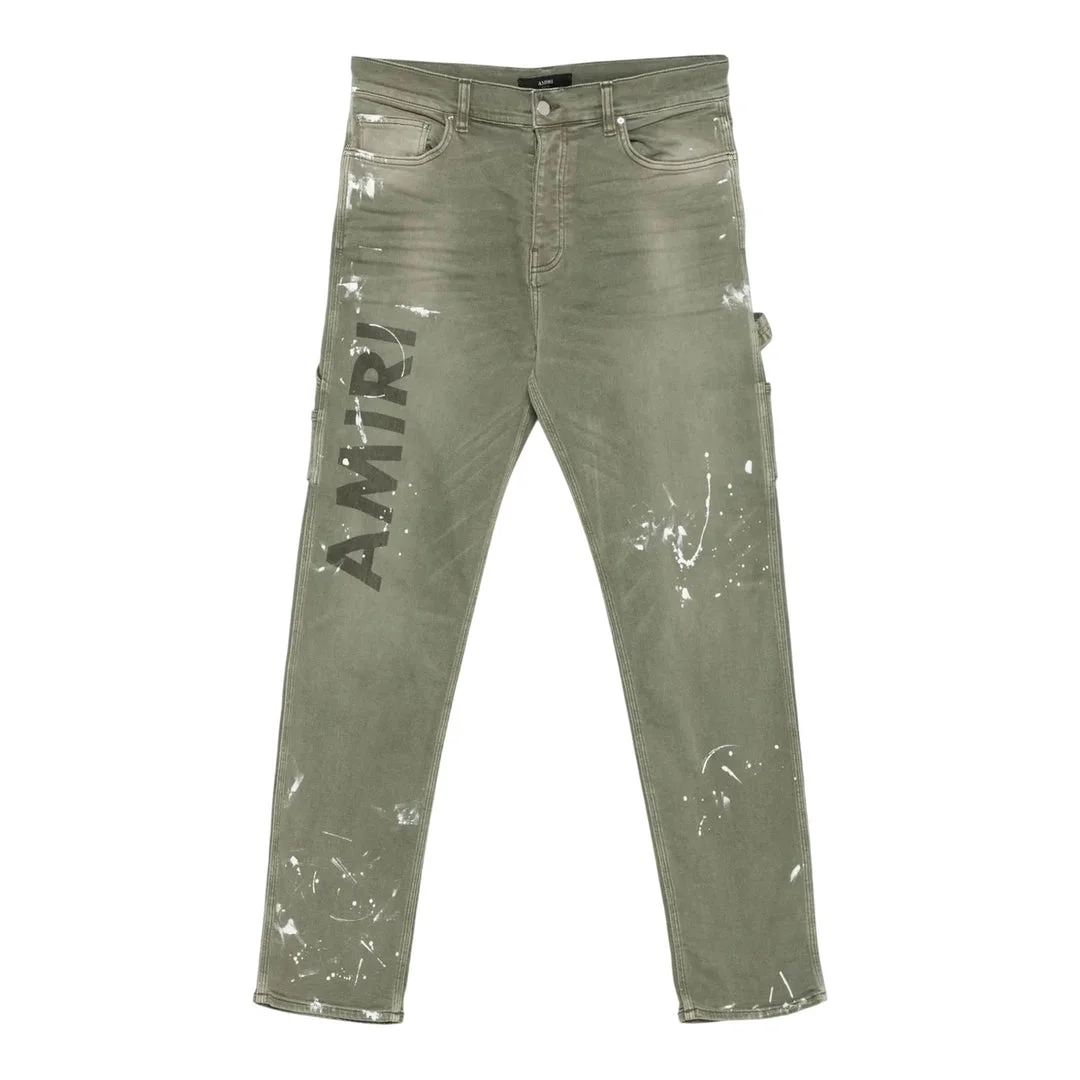600068875OLV031 / AMDNSM1018/00/326 - Stretch denim construction - Slim workman fit - Hand-painted splatter details - AMIRI logo print on leg - Distressed accents throughout - Five-pocket styling - Button fly closure - Vintage olive green wash AMIRI Army Logo Painted Slim Workman Jeans deliver luxury streetwear with military-inspired graphics and artisanal paint splatter detailing. Crafted from premium stretch denim in vintage olive green, featuring distressed accents and the signature AMIRI logo print down the leg. The slim workman fit combines contemporary tailoring with rebellious street aesthetic for an elevated casual look.