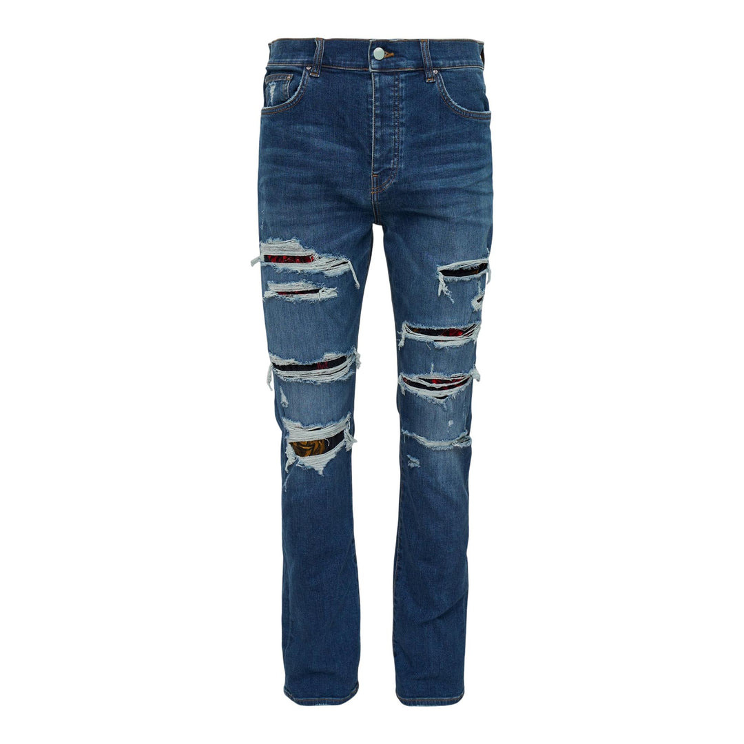 600069090IND030 / AMDNSM1022/00/950 - Strategic rips with colorful floral velvet patches - Hand-finished distressing throughout - Slim-fit silhouette - Five-pocket construction - Button fly closure - Premium denim construction - Signature AMIRI craftsmanship AMIRI Floral Velvet Slim Thrasher delivers luxury streetwear with signature distressed craftsmanship and premium construction. Crafted from high-quality denim with strategic rips and tears revealing colorful floral velvet patches underneath, creating the brand's iconic deconstructed aesthetic. The slim-fit silhouette and hand-finished distressing techniques showcase AMIRI's commitment to artisanal luxury denim.