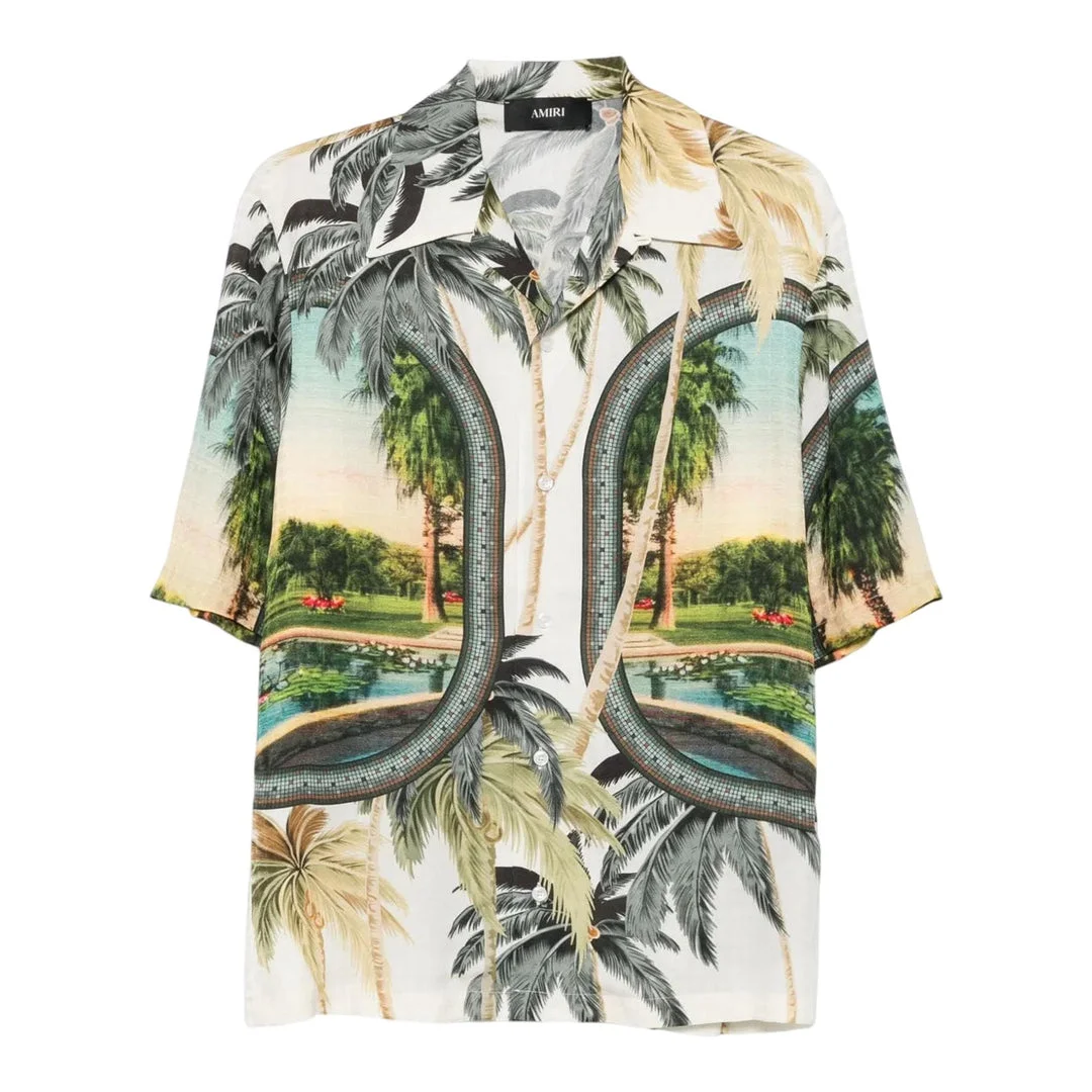 600068910MLT00S / AMSTCA1162/00/900 - Camp collar design - Short sleeves - Button-front closure - Tropical paradise print - Silk-blend construction - Relaxed fit - Curved hem The AMIRI Paradise Bowling Shirt delivers luxury streetwear with vintage-inspired tropical aesthetics and premium craftsmanship. Crafted from lightweight silk-blend fabric featuring vibrant palm tree and resort scenery prints in a classic bowling shirt silhouette. The relaxed camp collar and short sleeves create an effortless summer statement piece with signature AMIRI luxury detailing.