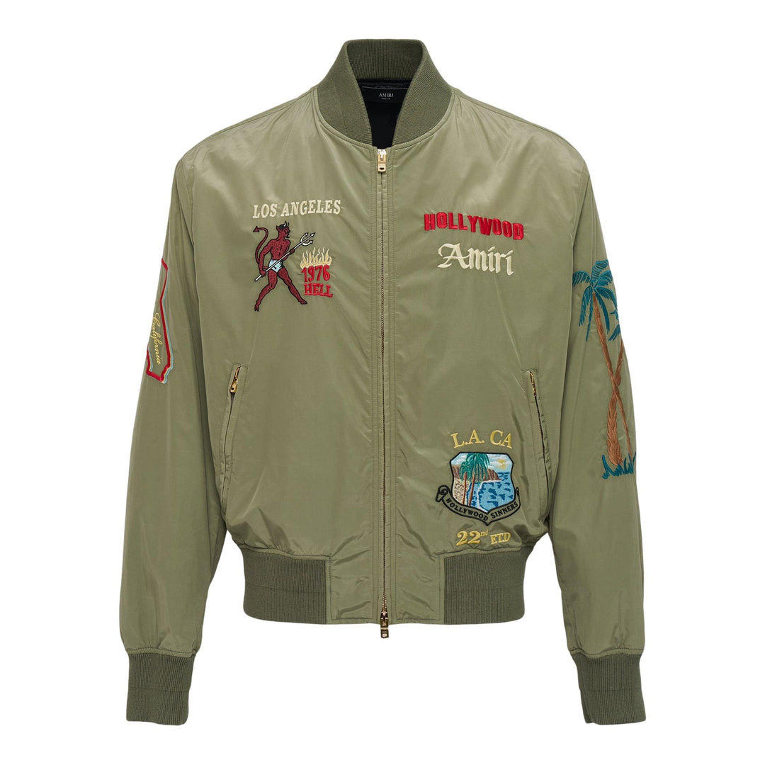 600068900OLV00M / AMOUBB1051/00/326 - Zip front closure with gold-tone hardware - Ribbed collar, cuffs, and hem - Embroidered Los Angeles and Hollywood patches - Devil and palm tree graphic details - 22nd Fed squadron patch - Two front zip pockets - Relaxed bomber fit - Lightweight nylon construction AMIRI Sinners Bomber delivers luxury streetwear with signature Los Angeles-inspired graphics and premium construction. Crafted from lightweight olive green nylon with embroidered patches including Hollywood, Los Angeles, and devil motifs throughout. The classic MA-1 silhouette features ribbed collar, cuffs, and hem with statement embellishments that showcase AMIRI's rock-and-roll aesthetic.