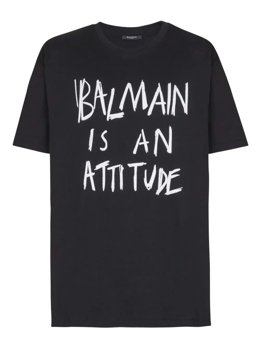 BALMAIN Attitude T-Shirt delivers bold streetwear luxury with signature brand confidence and contemporary design. Crafted from premium cotton in classic black, featuring the distinctive 'BALMAIN IS AN ATTITUDE' statement print in white lettering. The oversized fit and graphic messaging create an unmistakable statement piece that embodies the house's rebellious spirit.