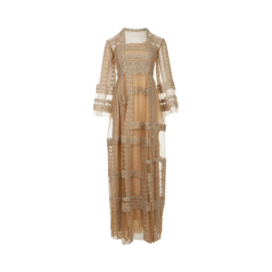 300049848GLD-SS / A5DB/FW25/022/00/GOLDEN TAN - Full-length maxi dress silhouette - Intricate beaded embellishments - Delicate tulle construction - Sheer paneling details - Long sleeves with lace trim - High neckline with ornate collar - Concealed back closure - Flowing A-line fit Biyan Itzel Beaded Tulle Full Length Dress delivers sophisticated elegance with intricate handcrafted detailing and luxurious silhouette. Made from delicate tulle fabric in warm champagne tones, featuring ornate beadwork and lace embellishments throughout the design. The dramatic floor-length construction and sheer paneling create a statement piece for special occasions and formal events.