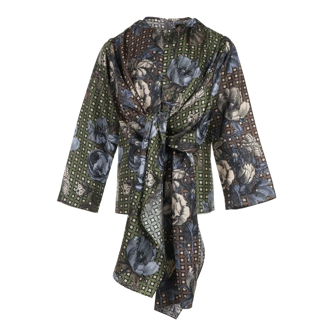 300049696GRN-SS / A5BB/FW25/022/00/GREY BLUE - G - Wrap-style front closure - Self-tie waist belt - Three-quarter kimono sleeves - Blue floral and geometric print - Lightweight silk construction - Relaxed fit through body - Asymmetrical hemline The Biyan JAGAD Floral Print Blouse delivers Indonesian couture elegance with contemporary sophistication. Crafted from lightweight silk featuring blue floral motifs against geometric patterns, with a self-tie waist belt for flattering silhouette definition. The kimono-inspired sleeves and wrap-style construction showcase Biyan's signature fusion of traditional artistry with modern tailoring.