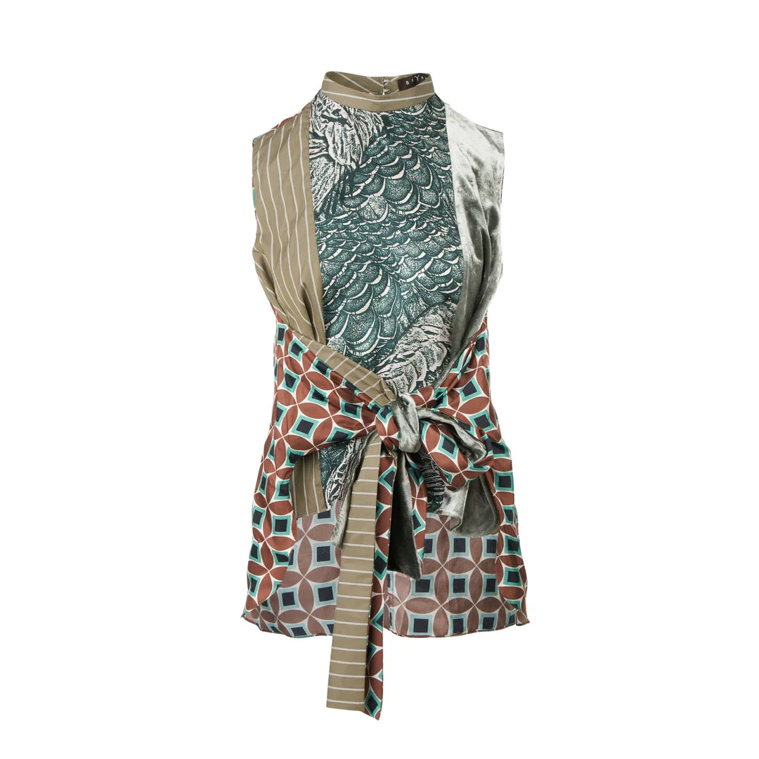 300049689MLT-SS / A5BB/FW25/002/00/MULTI - High mock neckline - Sleeveless design - Mixed print paneling - Detachable waist tie belt - Lightweight woven construction - Relaxed fit through body - Side seam detailing Biyan Juma Woven Top delivers contemporary sophistication with mixed print artistry and versatile styling options. Crafted from lightweight woven fabric featuring contrasting patterns including geometric motifs, scale textures, and striped elements in earthy tones. The sleeveless design with high neckline and detachable waist tie creates a modern silhouette perfect for layering or standalone wear.