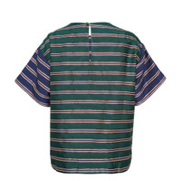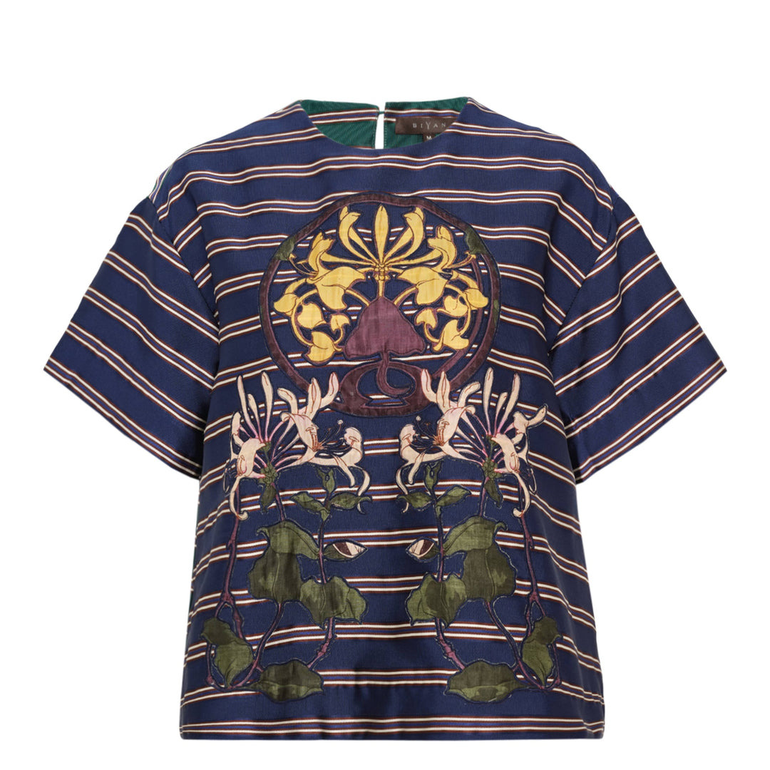 600083509NVY00M / BB/SS26/014/00/01 - Cotton-silk blend construction - Hand-applied floral embellishments - Contrast stripe pattern - Short sleeve design - Round neckline with back keyhole closure - Cascading botanical motifs - Relaxed fit Biyan Stripe Cotton Silk Short Sleeve delivers contemporary elegance with intricate floral embellishment and sophisticated craftsmanship. Made from premium cotton-silk blend in navy blue with contrast stripe detailing, featuring hand-applied floral motifs and cascading botanical elements. The relaxed short-sleeve silhouette and signature Biyan artistic embroidery create a statement piece that bridges traditional craft with modern luxury.
