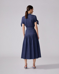 600069858NVY002 / P2511N218DEN/00/494 - Collarless mandarin neckline - Full button-front closure with gold-tone buttons - Short sleeves with tie detail at cuffs - Structured fit through body - Premium denim construction - Curved hem Carolina Herrera Tie Sleeve Collarless Button Down Top delivers contemporary elegance with feminine detailing and sophisticated silhouette. Crafted from premium denim fabric in deep indigo blue, featuring decorative tie sleeves and gold-tone button closure throughout. The collarless design and structured fit create a modern statement piece perfect for elevated casual styling.