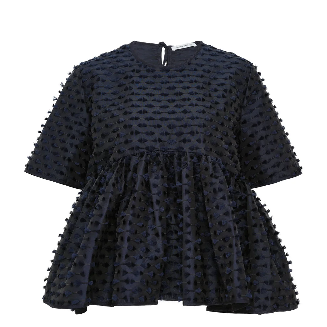 600077630NVY008 / 4.25RTW11015 CASANDRA/00/NAVY - Fil-coupe textured fabric with raised dot pattern - Empire waist with gathered skirt hem - Short voluminous sleeves - Round neckline - Back keyhole closure with tie fastening - Relaxed fit through body Cecilie Bahnsen Casandra Top delivers romantic femininity through architectural silhouette and textured fabrication. Crafted from luxurious fil-coupe fabric in navy with dimensional dot texture throughout, featuring voluminous sleeves and empire waist construction. The signature Danish craftsmanship and sculptural proportions create an elevated statement piece for contemporary wardrobes.