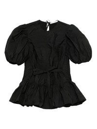 600071641BLK008 / 3.25RTW11003 BALE/00/BLACK - Dramatic puff sleeves with gathered elastic cuffs - Round neckline with back tie closure - Self-fabric tie belt at waist - Gathered peplum hem - Premium cotton construction - Fitted bodice with flared silhouette Cecilie Bahnsen Short Sleeved Top delivers romantic femininity with Danish craftsmanship and architectural silhouette. Crafted from premium cotton in sophisticated black, featuring dramatic puff sleeves and a cinched waist with matching tie belt. The gathered hemline and signature Bahnsen aesthetic create an elegant statement piece that embodies contemporary romance.