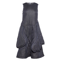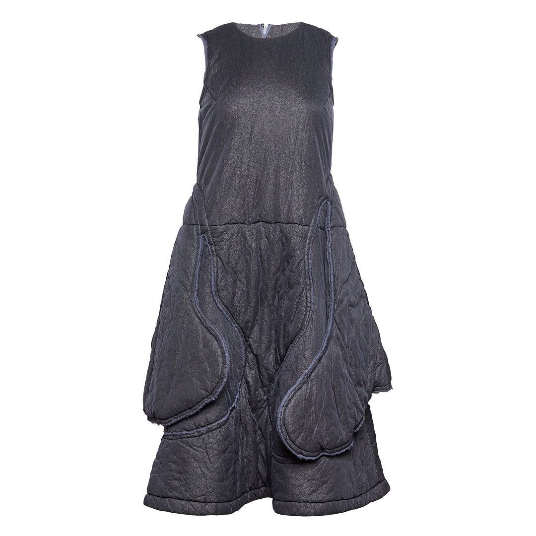 100136746NVY00M / GT-O016/051/2 - Bonded fabric construction - Round neckline - Sleeveless design - Quilted detailing - Dramatic draped skirt - Back zip closure - A-line silhouette - Midi length COMME des GARCONS Bonded Round Neck Dress delivers avant-garde femininity with architectural construction and innovative textile techniques. Crafted from bonded fabric in sophisticated charcoal with quilted detailing and dramatic draping throughout the skirt. The experimental silhouette and signature COMME des GARCONS deconstruction create a bold statement piece for contemporary wardrobes.