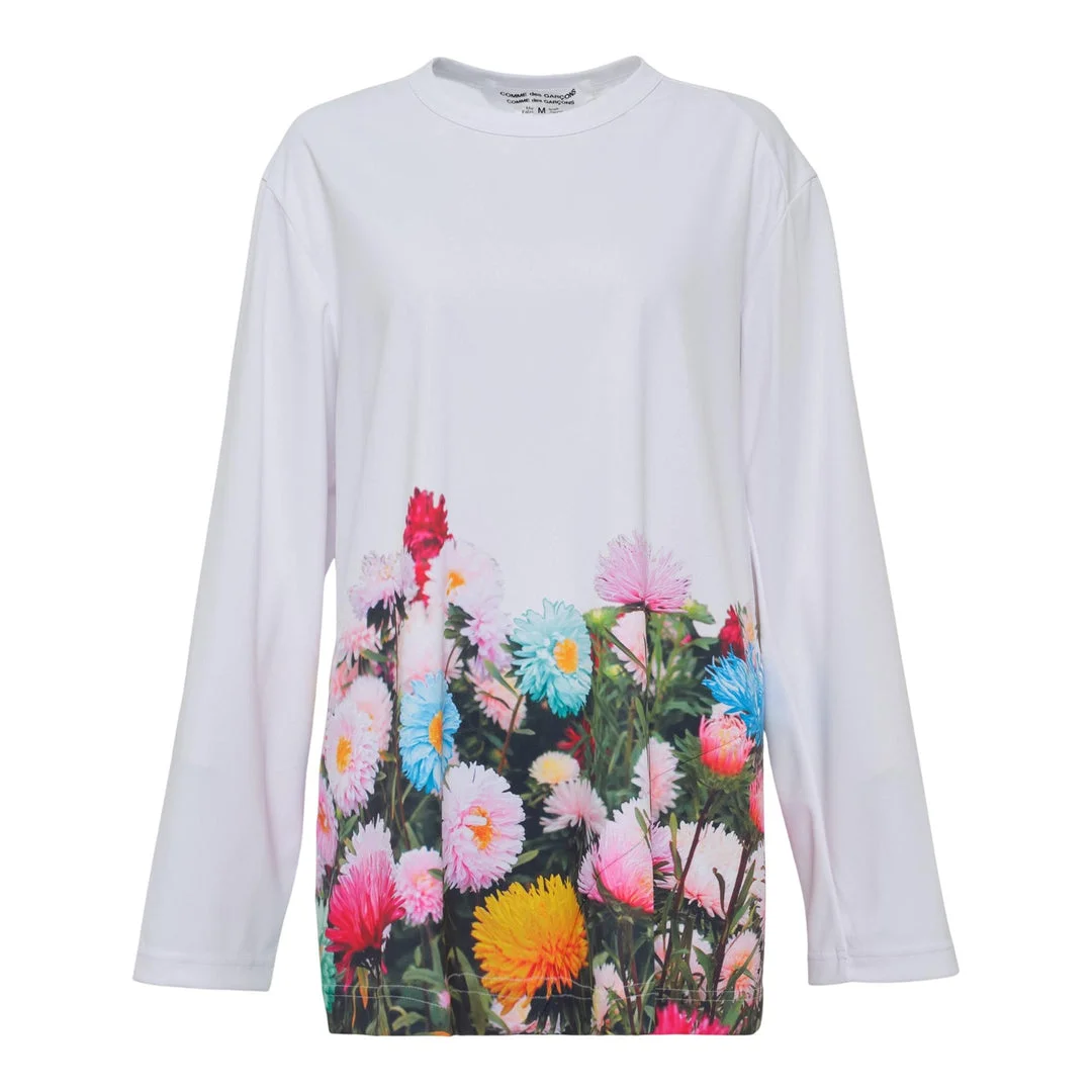600073490PRT00S / RO-T025/051/3 - Crew neckline with ribbed collar - Long sleeves with ribbed cuffs - Photographic floral print placement - Polyester jersey construction - Straight hem with side vents - Regular fit COMME des GARCONS Polyester Jersey Pattern Long Sleeve Tee delivers avant-garde design with vibrant floral artwork and comfortable everyday wear. Crafted from premium polyester jersey in crisp white, featuring a striking photographic flower print that creates visual impact from mid-section to hem. The signature COMME des GARCONS aesthetic transforms a classic tee silhouette into a statement piece of wearable art.