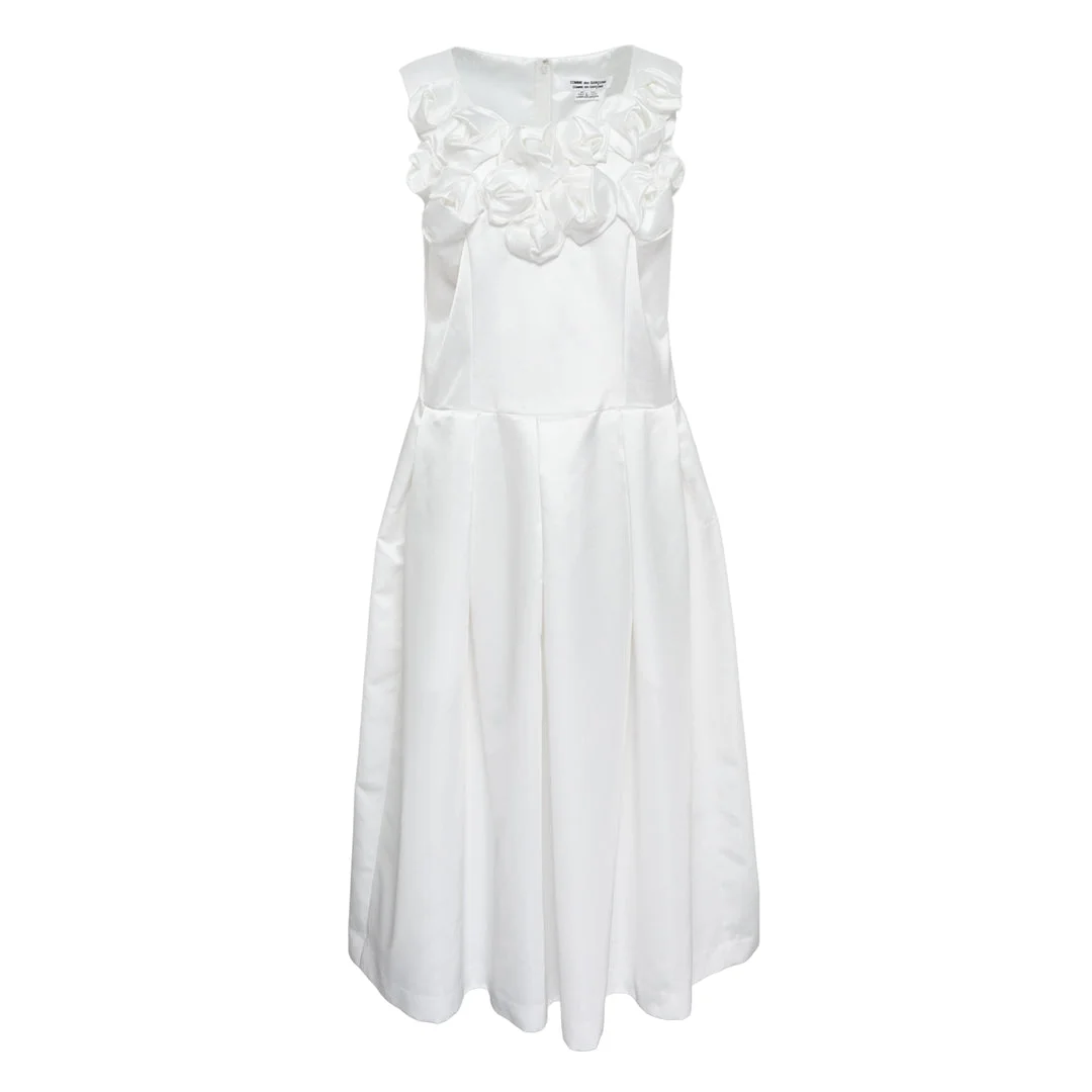600074008OWT00L / RP-O005/051/1/3A - Hand-applied rose appliques across bodice - Sleeveless design with wide armholes - Drop waist construction - Midi length hemline - Premium cotton construction - Relaxed fit silhouette - Back zip closure COMME des GARCONS Rose Applique Pinafore delivers avant-garde femininity with architectural draping and dimensional texture. Crafted from premium white cotton with hand-applied rose appliques across the bodice, featuring the brand's signature deconstructed approach to romantic elements. The sleeveless silhouette and drop-waist construction create a modern interpretation of classic pinafore styling.