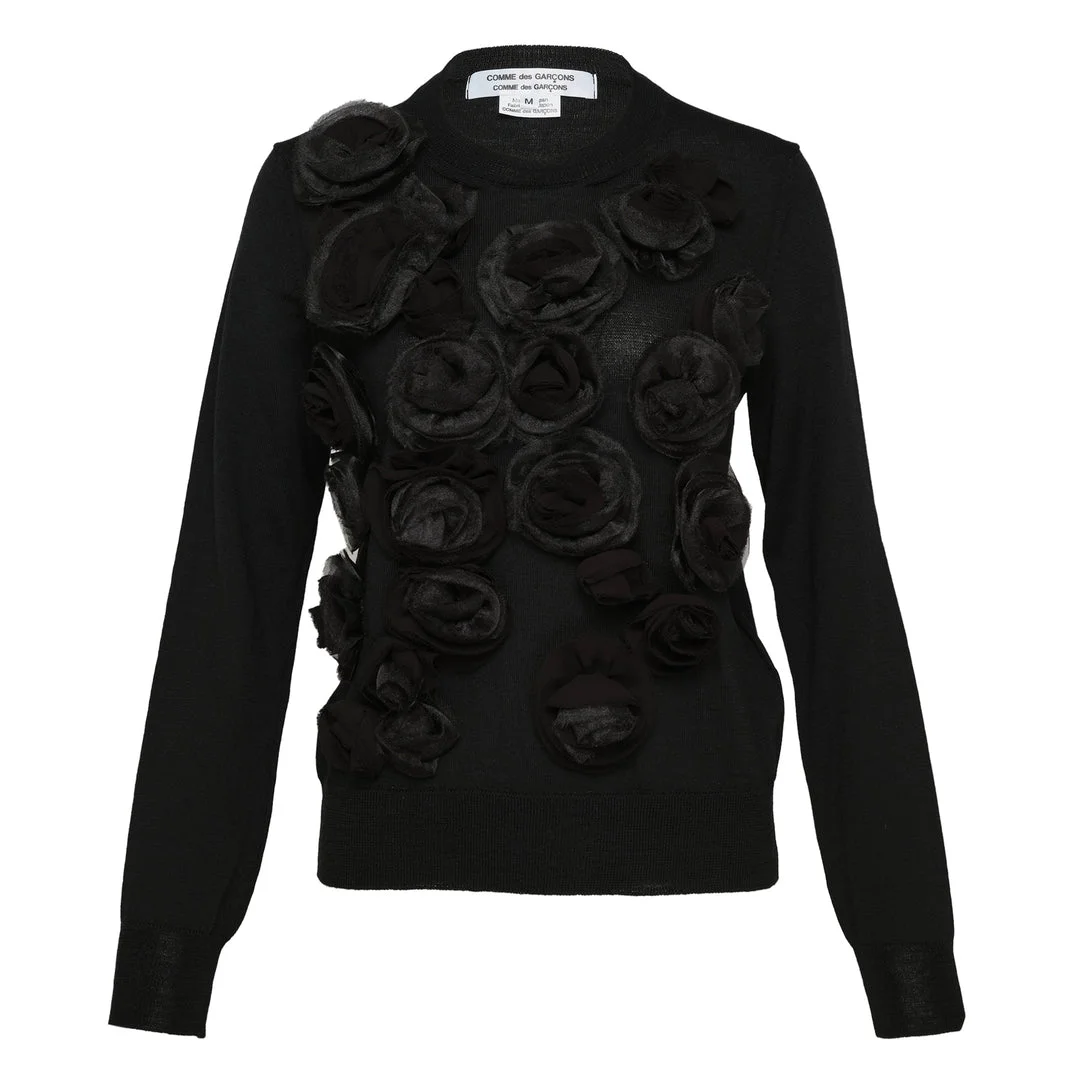 600080998BLK00M / RQ-N520/051/1/1A - Premium wool jersey construction - Hand-applied fabric rose embellishments - Dimensional flower embroidery - Ribbed collar, cuffs and hem - Long sleeves - Regular fit - Black colorway COMME des GARCONS Wool Jersey x Flower Embroidered Top delivers avant-garde femininity with dimensional floral craftsmanship. Made from premium wool jersey in sophisticated black, featuring hand-applied fabric roses and embroidered details across the front. The sculptural flower embellishments and signature COMME des GARCONS aesthetic create a striking statement piece for contemporary wardrobes.