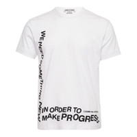 600064767WHT00S / OZ-T315/051/2 - Premium cotton jersey construction - Crew neck design - Short sleeves - Conceptual text print placement - Regular fit - Signature COMME des GARCONS branding COMME des GARCONS Cotton Jersey Print T-Shirt delivers avant-garde Japanese design with conceptual typography and unconventional placement. Crafted from premium cotton jersey in clean white, featuring bold black text graphics that wrap around the silhouette. The statement print reading "WE NEED SOMETHING NEW" and "IN ORDER TO MAKE PROGRESS" creates the brand's signature intellectual streetwear aesthetic.