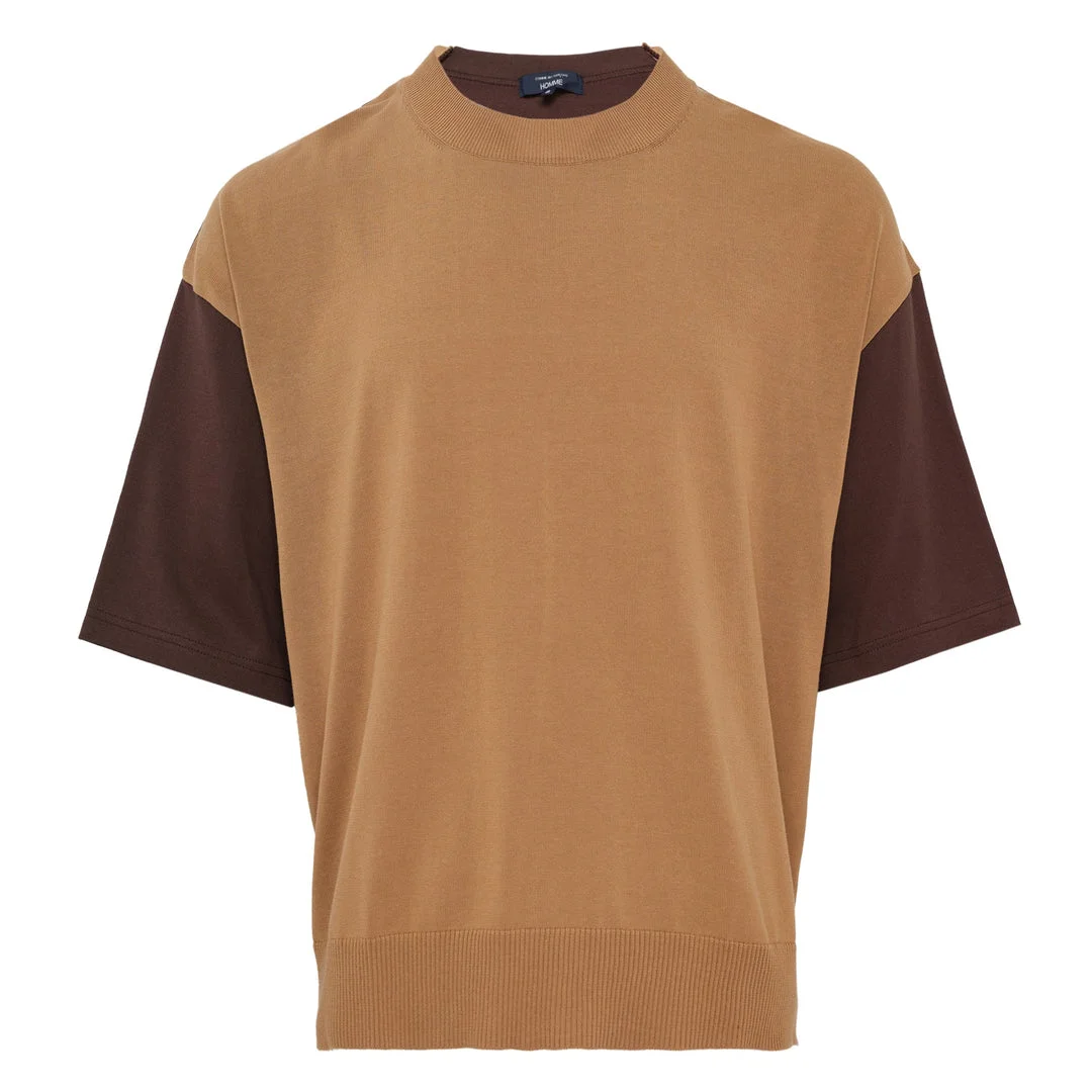 600078948BRN00L / HQ-T004/051/2/1A - Short sleeve construction - Ribbed crew neckline - Contrast brown sleeves - Oversized relaxed fit - Premium cotton knit fabric - Ribbed hem detail COMME des GARCONS HOMME Contrasting Colour-Block Panel T-Shirt delivers avant-garde design with distinctive colorway construction. Crafted from premium cotton knit in camel and chocolate brown tones, featuring contrast sleeves and ribbed collar detailing. The oversized silhouette and signature CDG aesthetic create a bold statement piece for contemporary streetwear enthusiasts.