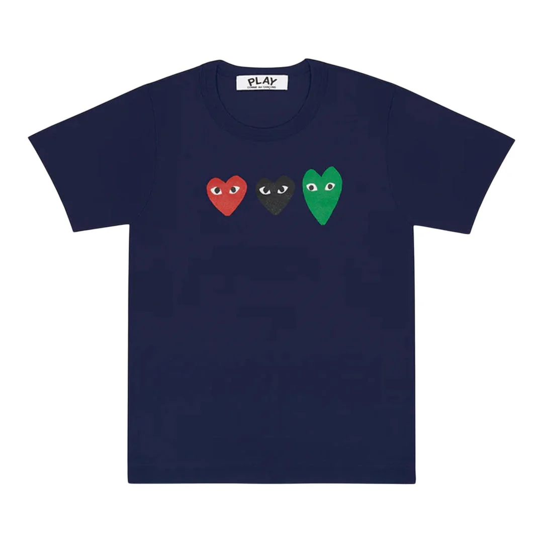 600052949NVYXXS / A-AX-T186/051/1 - Triple heart logo graphic on chest - Premium cotton construction - Crew neck design - Short sleeves - Unisex fit - Signature PLAY bug-eyed heart motif COMME des GARCONS PLAY 3 Brothers Tee delivers iconic Japanese streetwear with the brand's signature triple heart logo design. Crafted from premium cotton in deep navy, featuring three distinctive hearts in red, black, and green colorways with the iconic bug-eyed expression. The unisex cut and timeless PLAY aesthetic create a versatile statement piece for contemporary wardrobes.