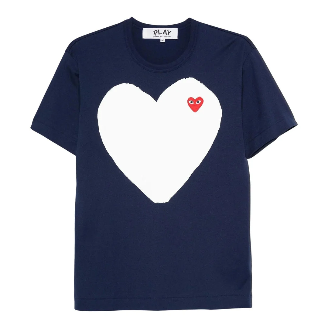 600061935NVYXXS / A-AX-T184/051/1 - Large white heart graphic print - Red PLAY heart emblem detail - Premium cotton construction - Crew neck - Short sleeves - Unisex sizing - Relaxed fit COMME des GARCONS PLAY Big Plain Heart Emblem Tee delivers iconic Japanese streetwear with the brand's signature heart motif. Crafted from premium cotton in deep navy with an oversized white heart graphic and the iconic red heart emblem. The unisex design and timeless PLAY aesthetic make it a coveted wardrobe essential.