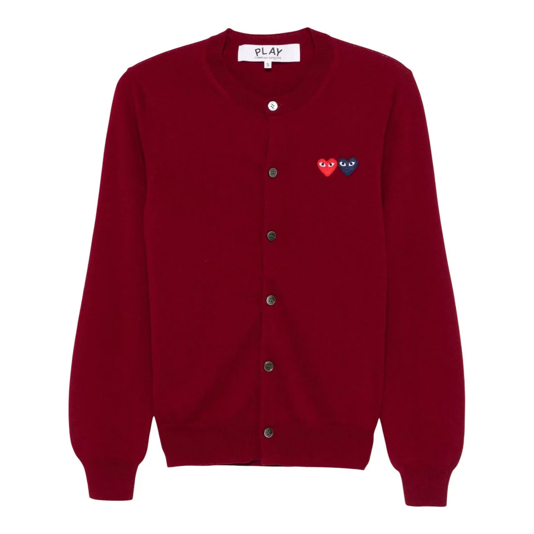 600059103BURXXS / A-AX-N057/051/4 - Iconic red and blue heart logo embroidery - Classic V-neck design - Button-front closure with branded buttons - Ribbed cuffs and hem - Premium wool blend construction - Regular fit COMME des GARCONS PLAY Red Heart Emblem Cardigan delivers Japanese avant-garde style with playful sophistication. Crafted from premium wool blend in rich burgundy, featuring the iconic dual heart logo embroidery on the chest. The classic V-neck silhouette and signature PLAY aesthetic create a distinctive wardrobe essential with contemporary appeal.