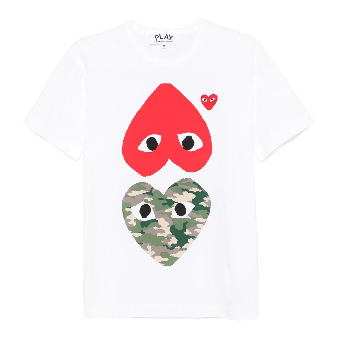 300048212WHT-SS / BSAX-T248/051/001 - Premium cotton jersey construction - Short sleeve design - Crew neckline - Signature red heart logo with eyes - Camouflage heart graphic - Unisex fit - Machine washable COMME des GARCONS PLAY Camo Bottom Heart Tee delivers iconic Japanese streetwear with playful graphic contrast. Crafted from premium cotton jersey in crisp white, featuring the signature red heart logo and camouflage heart design below. The dual heart motif creates a bold statement piece that embodies the brand's avant-garde aesthetic.