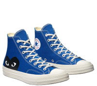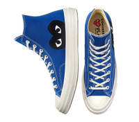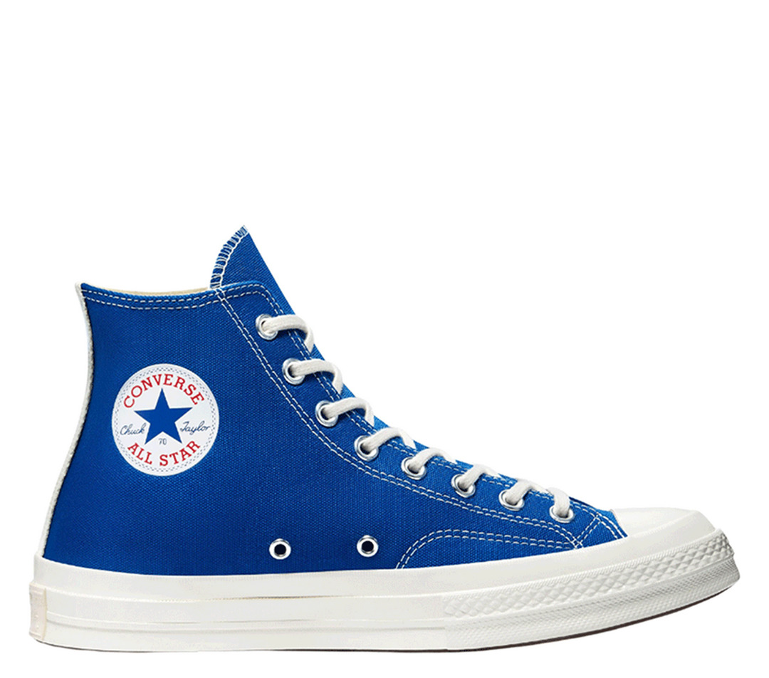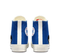 COMME des GARCONS PLAY Converse PLAY Converse Chuck 70 Peek-A-Boo Heart High Cut Sneakers This COMME des GARCONS PLAY x Converse sneaker features a premium canvas upper with an oversized, iconic CDG PLAY heart-and-eyes graphic. Ortholite insoles for comfort. Rubber outsole and toecap. - Upper: Cotton / Sole: Rubber - Blue