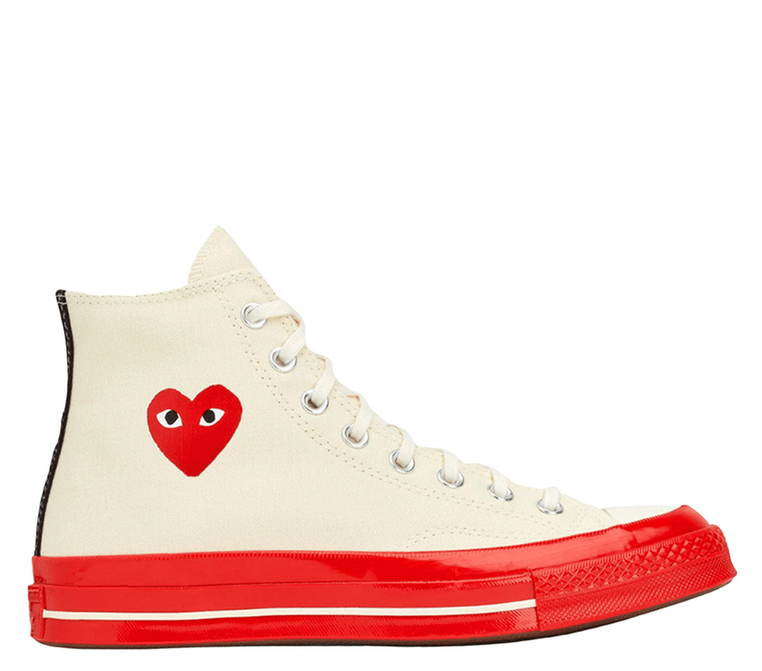 PLAY Comme des Garcons Converse High Cut Converse Chuck Taylor Reimagining the first Converse x PLAY Comme des Garcons design, this iteration features a red midsole and foxing with a contrast pinstripe and is rendered in both black and white premium canvas stamped with the instantly recognisable heart-and-eyes logo. Please choose your usual size. Note that this product offers two equivalent sizes, hence the different product codes. That means whether you select size 3 or size 3 (Three), you will receive the same item (size 3). - Upper: Textile / Sole: Rubber - White - Style: P1K124 - This product is in Mens UK sizes