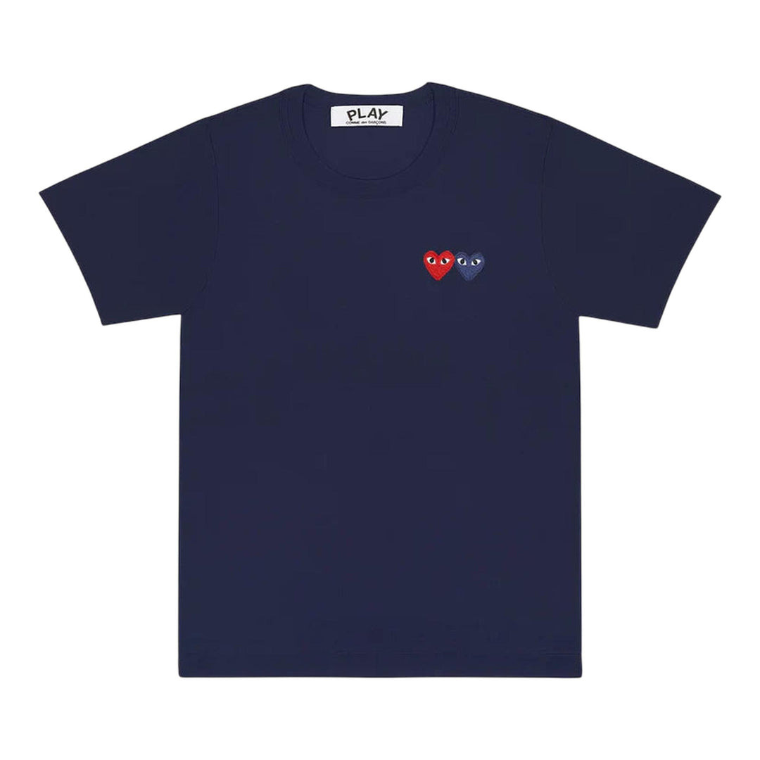600050232NVYXXS / A-AX-T226/051/2 - Dual heart logo embroidery on chest - Signature red and navy heart design - Classic crew neckline - Short sleeves - Premium cotton construction - Unisex relaxed fit - Ribbed neckband COMME des GARCONS PLAY Double Heart Tee delivers iconic Japanese streetwear with signature dual heart emblem design. Crafted from premium cotton in sophisticated navy blue, featuring the brand's distinctive red and blue heart logos on the chest. The unisex cut and timeless design make this an essential piece for contemporary wardrobes.