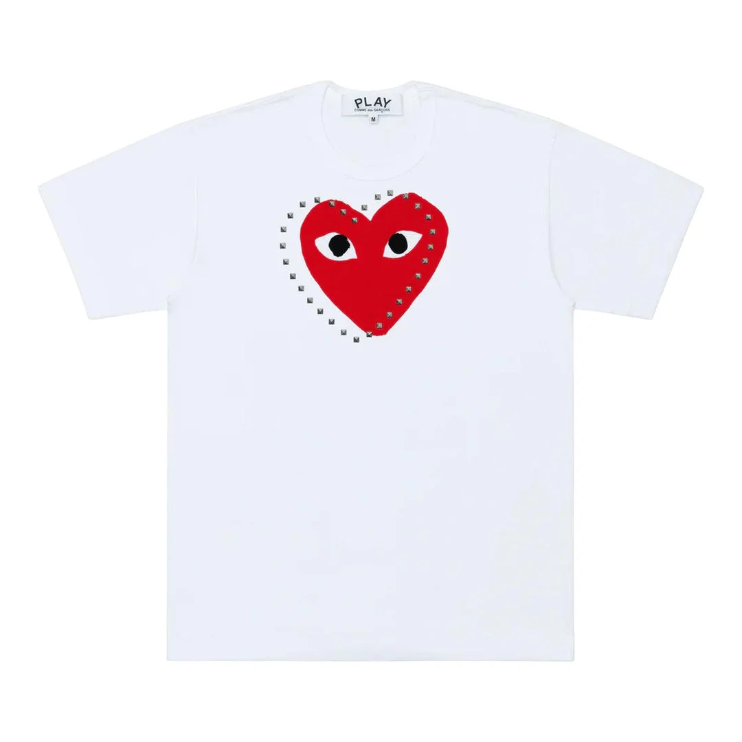 600061779RED3XS / A-AX-T803/051/1 - Metal stud embellishments around heart logo - Classic crew neck - Short sleeves - Premium cotton construction - Iconic red heart logo with eyes - Unisex fit - Ribbed neckline COMME des GARCONS PLAY Logo Stud T-Shirt delivers iconic streetwear with playful punk-inspired detailing and unisex versatility. Crafted from premium cotton in crisp white, featuring the signature red heart logo adorned with metal studs for added edge. The classic crew neck silhouette and studded embellishment create a perfect balance of minimalist design and rebellious attitude.