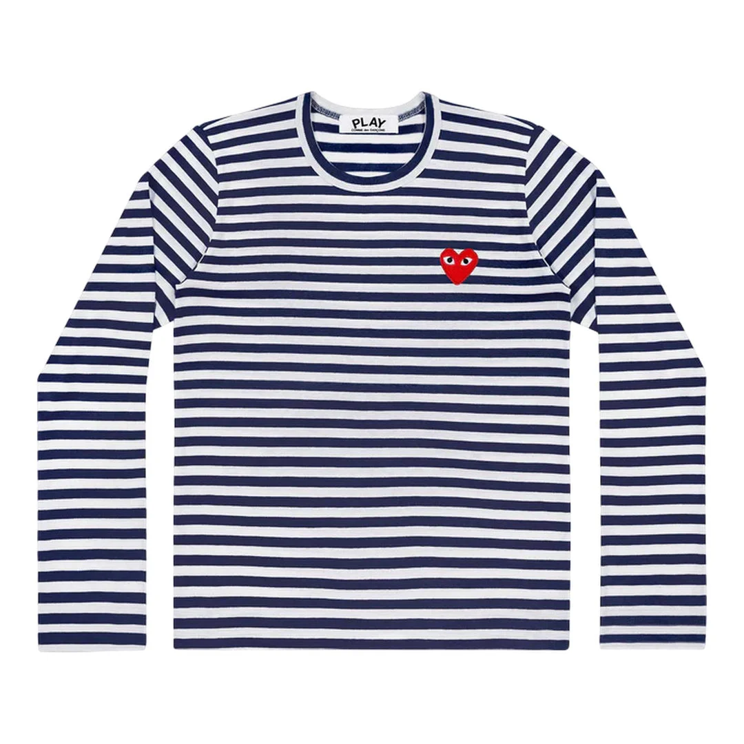 600052936BLUXXS / A-AX-T010/051/1 - Classic crew neckline - Long sleeves with ribbed cuffs - Horizontal navy and white stripes - Red heart logo embroidery on chest - Premium cotton construction - Unisex fit - Ribbed neckband and hem COMME des GARCONS PLAY Long Sleeve Striped Tee delivers iconic Japanese streetwear with the brand's signature heart emblem design. Crafted from premium cotton in classic navy and white horizontal stripes, featuring the distinctive red heart logo with eyes. The timeless Breton-inspired pattern and unisex fit create a versatile wardrobe staple that embodies PLAY's playful aesthetic.