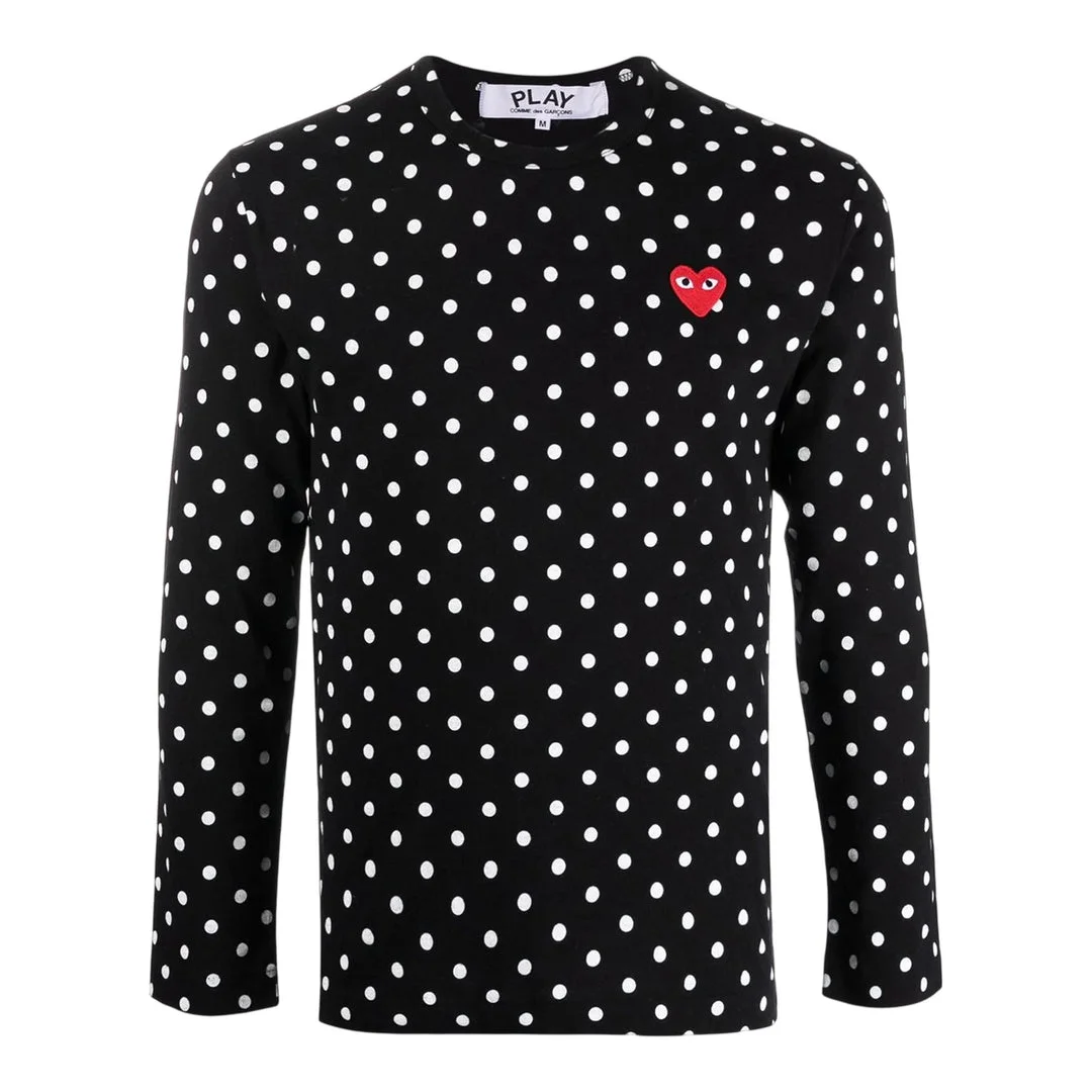 600052945BLK00S / A-AX-T166/051/1 - Iconic red heart logo with eyes - All-over white polka dot pattern - Crew neck construction - Long sleeves - Premium cotton fabric - Unisex fit - Ribbed collar and cuffs COMME des GARCONS PLAY Polka Dots Red Emblem Tee delivers playful Japanese design with signature avant-garde sensibility. Crafted from premium cotton in classic black with white polka dot pattern, featuring the iconic red heart logo with eyes. The unisex design and comfortable fit make it a versatile wardrobe staple with distinctive PLAY aesthetic.