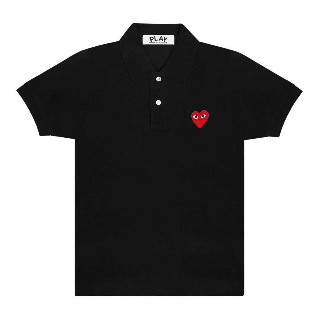 600050224BLKXXS / A-AX-T006/051/1 - Classic polo collar - Two-button placket - Short sleeves - Signature red heart logo embroidery - Cotton pique construction - Regular fit - Ribbed collar and cuffs COMME des GARCONS PLAY Red Emblem Polo Shirt delivers minimalist luxury with iconic streetwear appeal. Crafted from premium cotton pique in classic black, featuring the signature red heart logo with distinctive eyes embroidered on the chest. The clean construction and timeless polo silhouette create a versatile wardrobe staple with unmistakable PLAY branding.