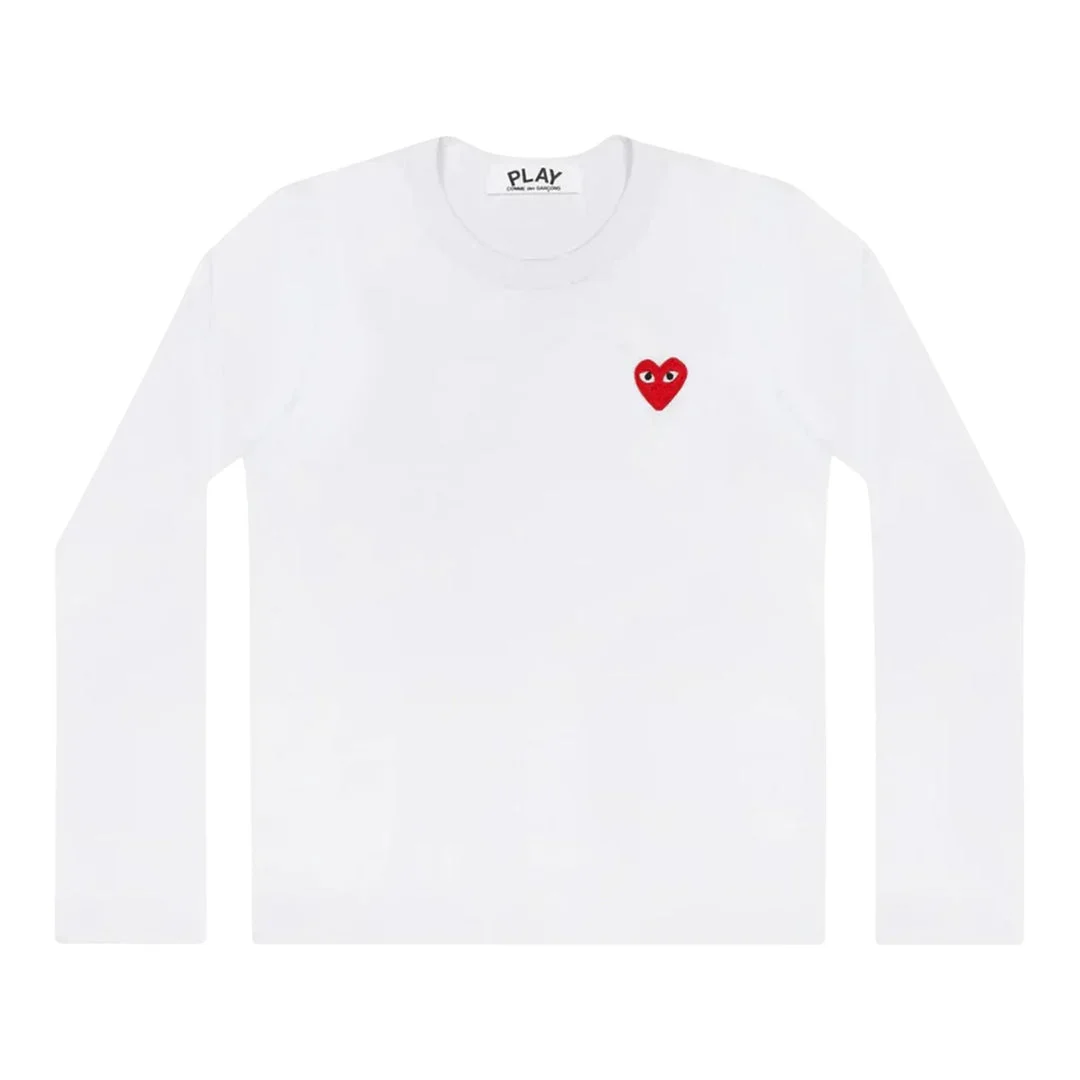 600067434WHTXXS / A-AX-T118/051/2 - Iconic red heart emblem with eyes - Premium cotton jersey construction - Crew neck design - Long sleeves - Unisex fit - Ribbed collar and cuffs COMME des GARCONS PLAY Red Emblem Tee delivers iconic Japanese streetwear with the brand's signature heart logo. Crafted from premium cotton jersey in crisp white, featuring the instantly recognizable red heart emblem with eyes on the chest. The unisex cut and timeless design make this a wardrobe staple for contemporary style enthusiasts.