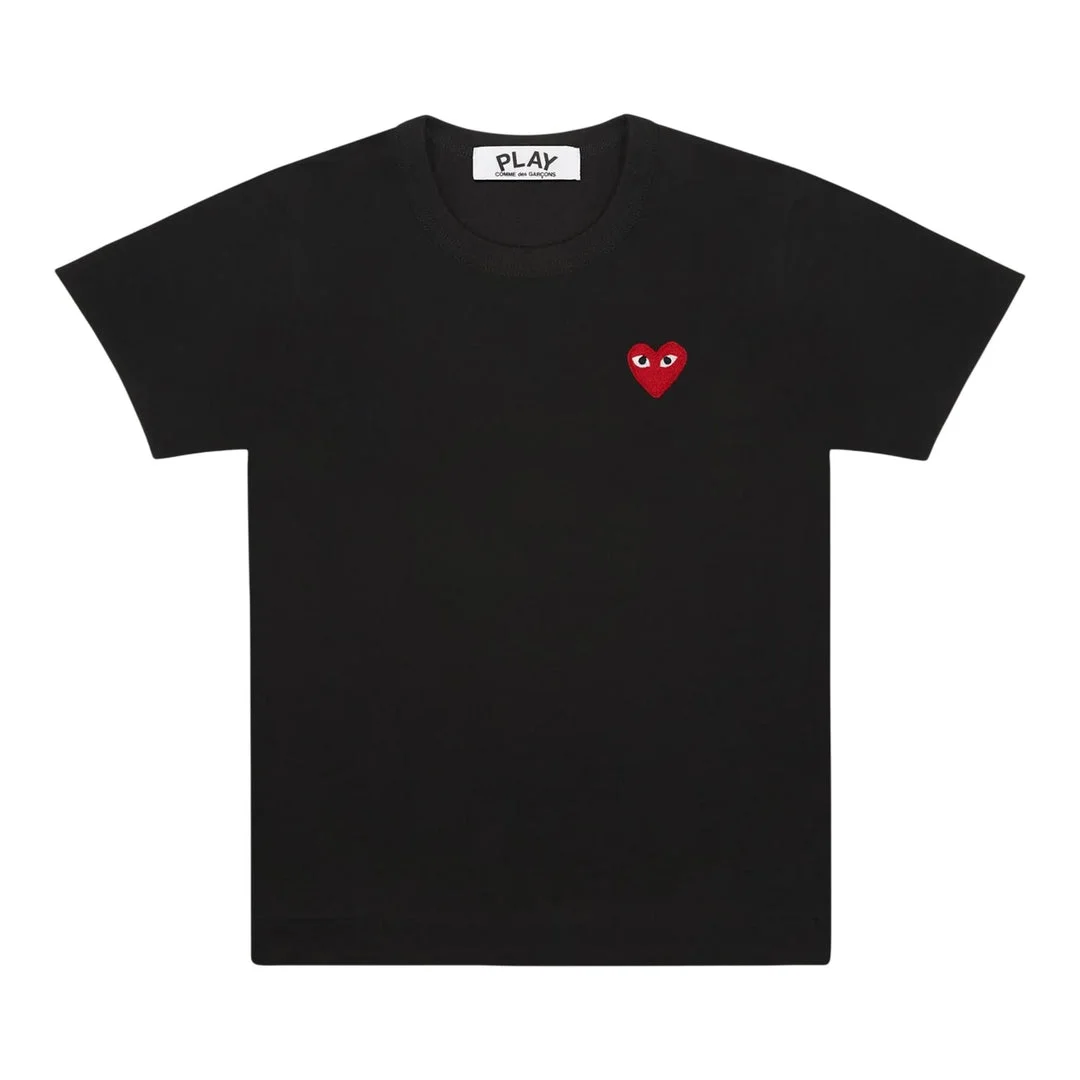 600050230BLKXXS / A-AX-T108/051/1 - Red heart logo embroidered on chest - 100% cotton construction - Crew neck design - Short sleeves - Unisex fit - Classic black colorway - Ribbed neckline COMME des GARCONS PLAY Red Emblem Tee delivers iconic Japanese streetwear with the signature red heart logo embroidered on premium cotton. Crafted from soft, comfortable cotton in classic black, featuring the instantly recognizable heart with eyes design that defines the PLAY line. The timeless unisex silhouette and subtle branding create an effortlessly cool statement piece for any wardrobe.