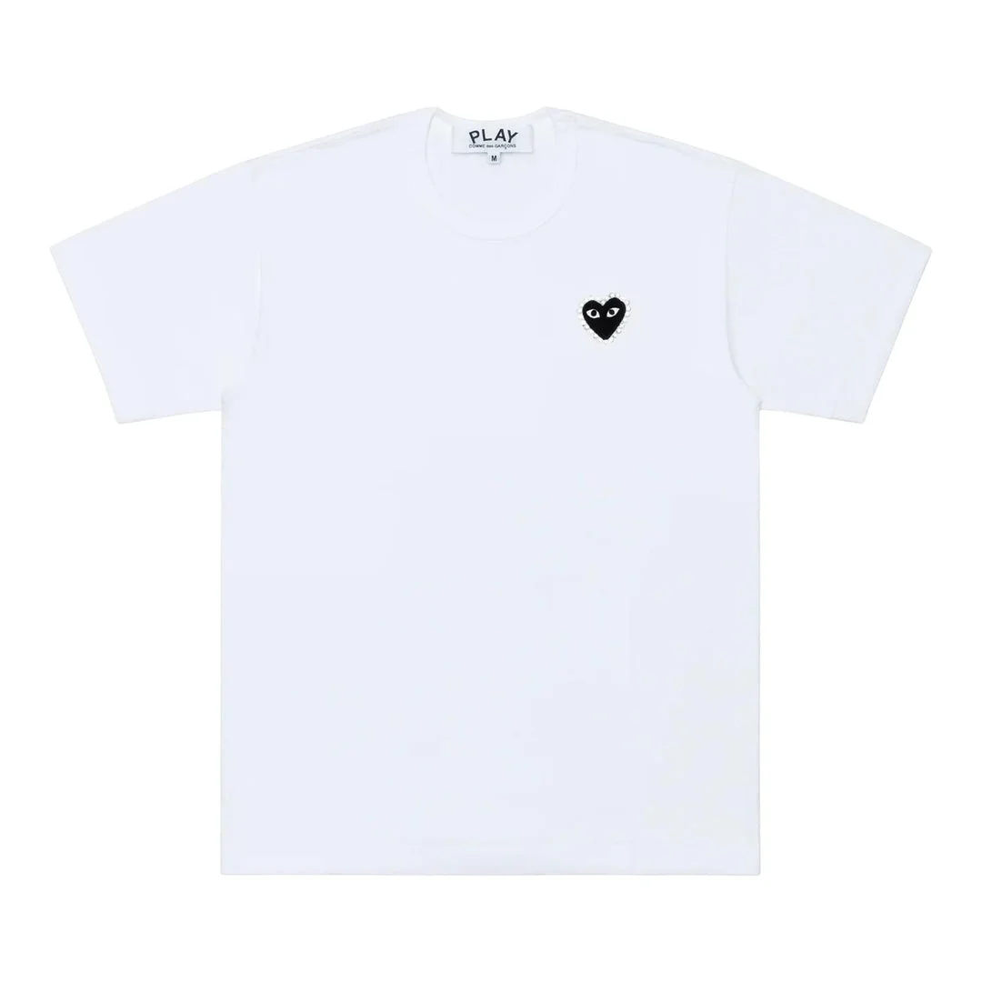 600061777BLK3XS / A-AX-T801/051/1 - Signature CDG PLAY heart logo with rhinestone detailing - Premium cotton jersey construction - Crew neck design - Short sleeves - Unisex fit - Ribbed neckline and cuffs COMME des GARCONS PLAY Rhinestone Emblem T-Shirt delivers iconic streetwear luxury with signature heart logo detailing. Crafted from premium cotton jersey in classic white, featuring the brand's distinctive black heart emblem with rhinestone accents. The unisex design and timeless construction make this an essential piece for contemporary wardrobes.