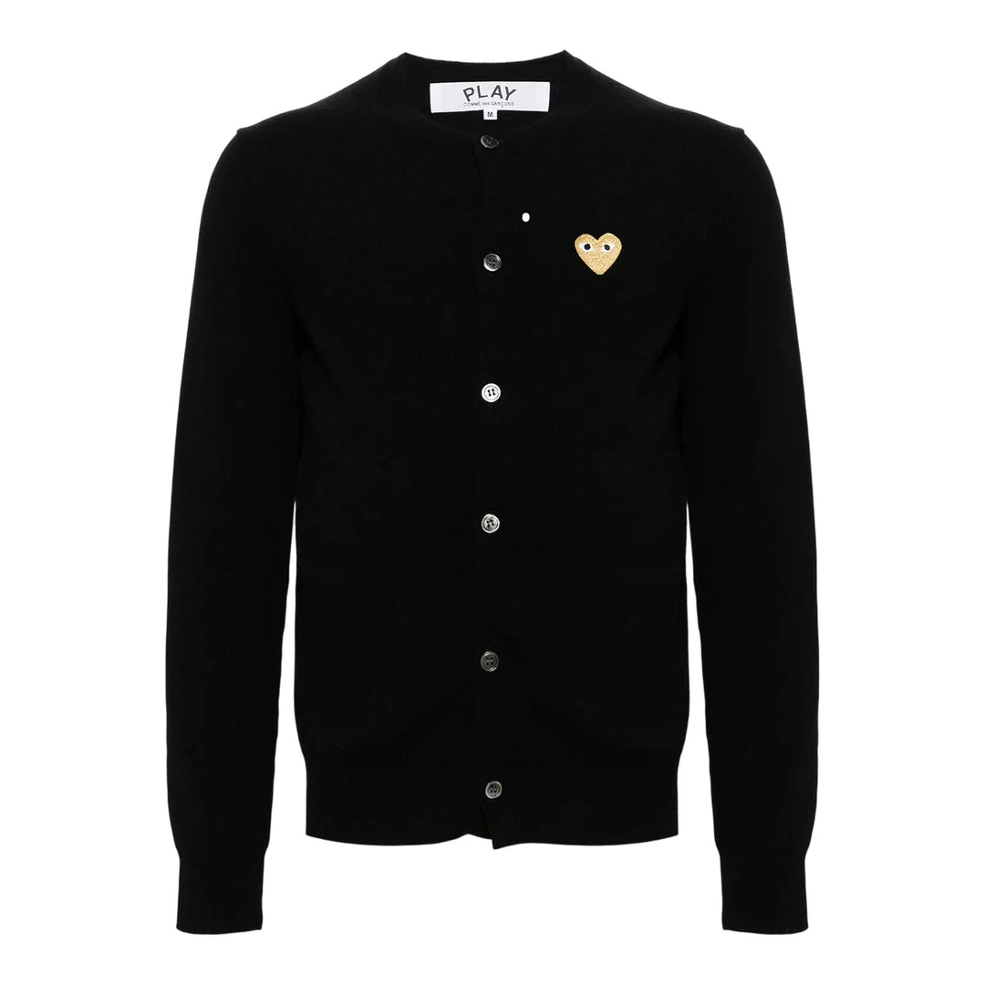 600052934BLKXXS / A-AX-N049/051/1 - Button-front closure with contrasting buttons - Round neckline - Long sleeves with ribbed cuffs - Iconic gold heart emblem with eyes - Premium knit construction - Ribbed hem and cuffs - Relaxed fit COMME des GARCONS PLAY Round-Neck Gold Emblem Cardigan delivers minimalist luxury with the brand's signature heart motif craftsmanship. Made from premium knit construction in classic black, featuring the iconic gold heart emblem with distinctive eyes design. The clean round neckline and button-front closure create a sophisticated piece that embodies the PLAY line's contemporary aesthetic.