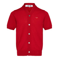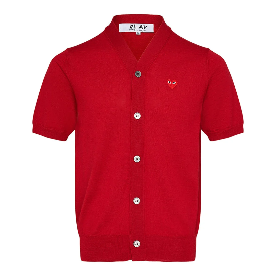 600049623REDXXL / A-AX-N096/051/5 - Classic button-front closure - Iconic heart logo embroidery - Short sleeve design - Ribbed collar and cuffs - Premium wool knit construction - Regular fit The COMME des GARCONS PLAY Short Sleeve Cardigan delivers avant-garde sophistication with versatile layering potential. Crafted from premium wool knit in vibrant red, featuring the iconic heart logo and classic button-front closure. The contemporary short-sleeve design offers modern elegance for transitional seasons and elevated casual styling.