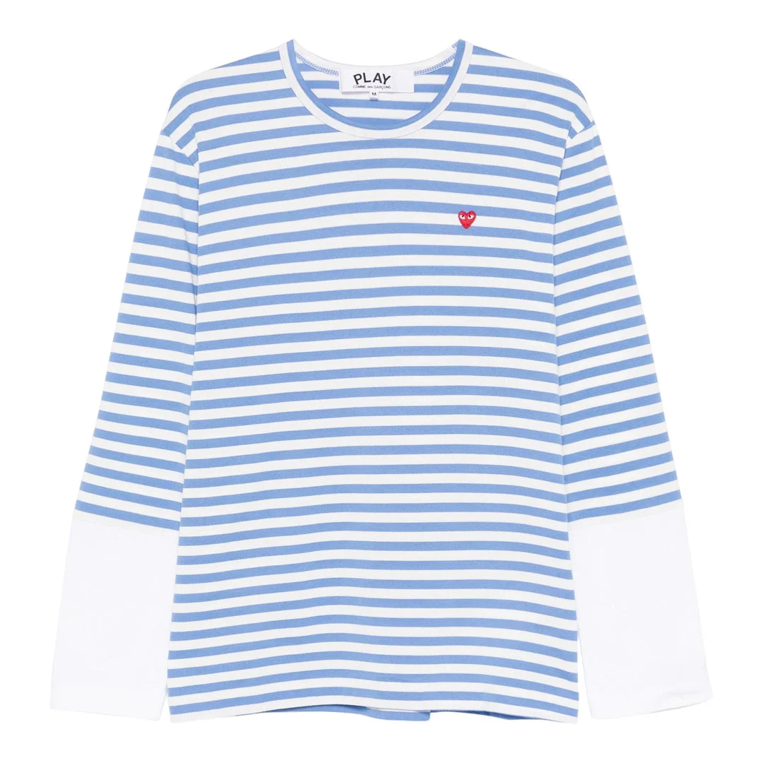 300040495BLU-LL / BSA-AX-T320/051/1 - Small red heart emblem with eyes embroidered on chest - Blue and white horizontal stripes - Round crew neckline - Short sleeves - Premium cotton construction - Unisex relaxed fit - Straight hem COMME des GARCONS PLAY Small Red Emb Striped Tee delivers iconic Japanese streetwear with signature heart emblem design. Crafted from premium cotton in classic blue and white stripes, featuring the distinctive small red heart logo with eyes. The unisex cut and timeless stripe pattern create a versatile wardrobe essential with unmistakable CDG PLAY identity.