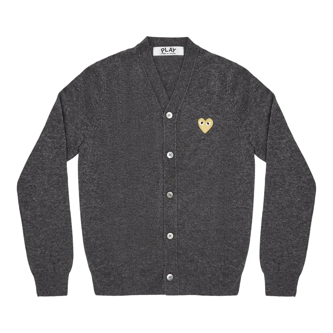 600052935GRY00S / A-AX-N050/051/3 - V-neck collar with ribbed trim - Button-front closure with matching buttons - Iconic golden heart logo with eyes - Long sleeves with ribbed cuffs - Ribbed hem construction - Premium wool knit fabric - Regular fit COMME des GARCONS PLAY V-Neck Cardigan delivers minimalist luxury with the brand's signature playful sophistication. Crafted from premium knitted wool in sophisticated charcoal gray, featuring clean lines and structured construction for versatile layering. The iconic golden heart emblem with eyes creates an instantly recognizable statement piece that defines contemporary Japanese fashion.