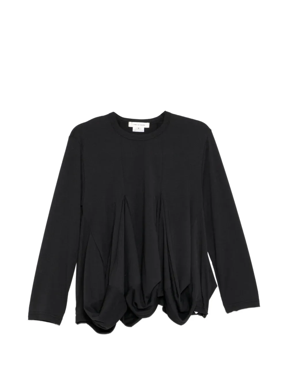 600080768BLK00L / GQ-T013/051/1/1A - Twisted front knot detailing - Draped asymmetrical panels - Long sleeves with fitted cuffs - Crew neckline - Premium polyester jersey construction - Relaxed fit through body COMME des GARCONS Polyester Jersey delivers avant-garde comfort with signature deconstructed design elements. Crafted from premium polyester jersey in classic black, featuring draped front panels with twisted knotted detailing. The architectural silhouette and innovative construction techniques create a distinctive statement piece that embodies the brand's experimental aesthetic.