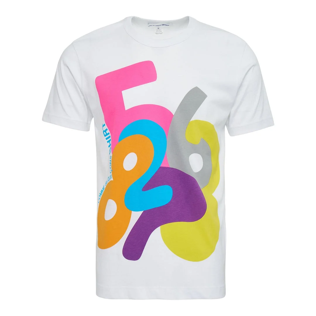 600073566WHT0XS / FP-T001/051/2/1A - Crew neck construction - Short sleeves - Digital print graphic design - Multi-color number motifs - Premium cotton fabrication - Regular fit - Ribbed neckline and cuffs COMME des GARCONS SHIRT Digital Print Color-Block Tee delivers avant-garde streetwear with bold graphic design and contemporary aesthetic. Crafted from premium cotton in crisp white, featuring vibrant multi-colored overlapping number graphics in pink, blue, orange, purple, and yellow. The signature CDG experimental approach to print design creates a striking statement piece that embodies the brand's innovative spirit.