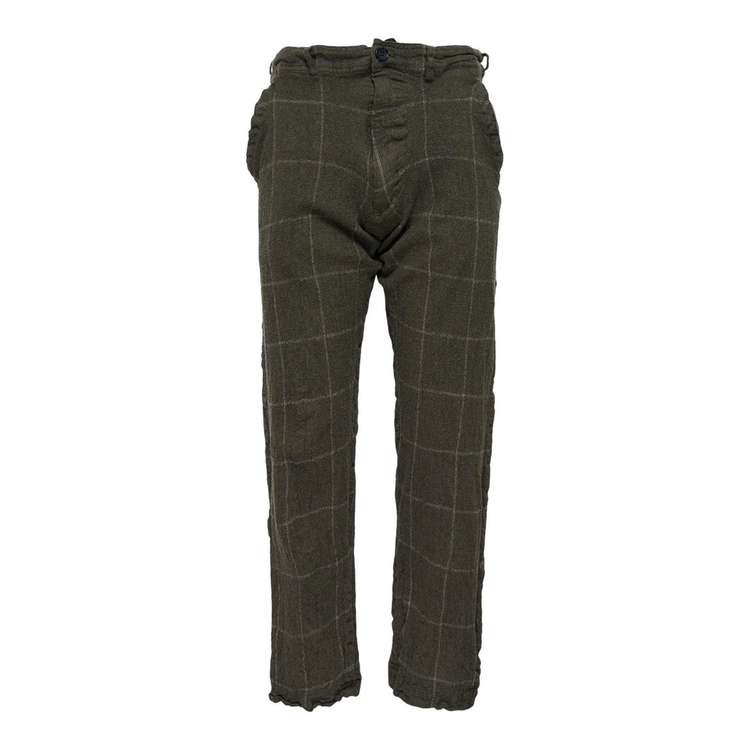600073564KHA00L / FP-P503/051/2/2A - Premium wool construction - Distinctive windowpane check pattern - Button and zip front closure - Belt loops at waistband - Side and back pockets - Relaxed straight-leg fit - Unfinished hem details COMME des GARCONS SHIRT wool windowpane check pants deliver avant-garde tailoring with sophisticated pattern work and architectural construction. Crafted from premium wool in olive green with distinctive windowpane grid pattern, featuring the brand's signature deconstructed approach to menswear. The relaxed fit and premium wool fabrication create a refined statement piece for contemporary wardrobes.
