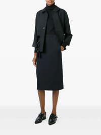 300049291BLK-XS / A5GP-J011-051/00/BLACK - Premium wool gabardine construction - Hard finish treatment - Point collar design - Button front closure - Ribbon tie details at waist - Three-quarter length sleeves - Relaxed fit silhouette - Unlined construction COMME des GARCONS Wool Gabardine Stripe Hard Finish Jacket delivers avant-garde sophistication with architectural construction and contemporary silhouette. Crafted from premium wool gabardine with hard finish treatment in dark navy, featuring ribbon tie details that create adjustable waist definition. The structured construction and signature COMME des GARCONS aesthetic elevate this piece into wearable art for the modern wardrobe.