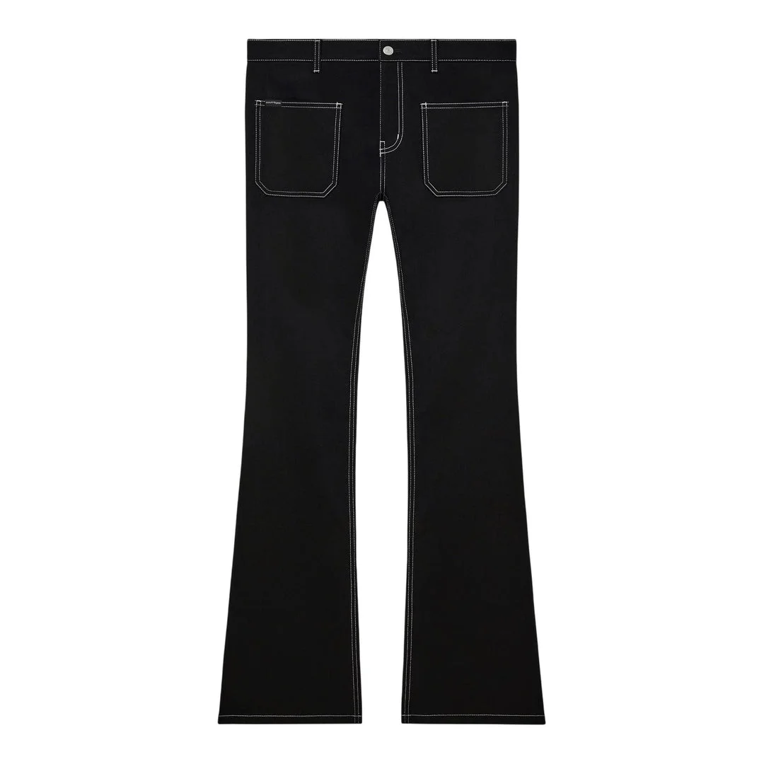 300043827BLK-33 / P4324DPA208DE0020/00/B044 - Premium black denim construction - Contrasting white topstitching detail - Classic bootcut silhouette - Two front patch pockets - High-rise waist - Button and zip fly closure - Structured fit Courreges Bootcut Pants deliver contemporary French luxury with a modern take on classic denim silhouettes. Crafted from premium black denim with contrasting white topstitching, featuring a flattering bootcut leg and minimalist two-pocket design. The structured fit and signature Courreges aesthetic create a sophisticated foundation piece for modern wardrobes.