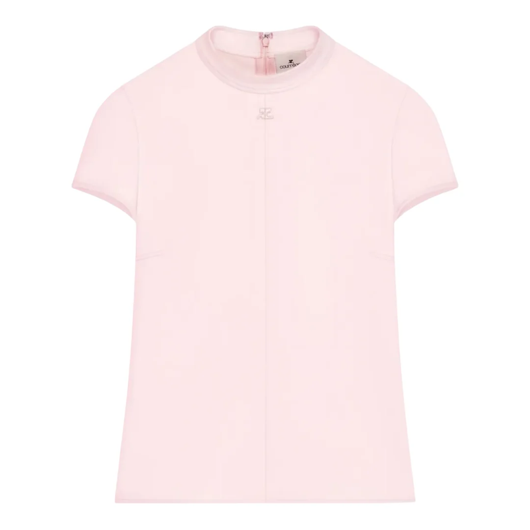 600079356PNK034 / 126CTO472PL0159/00/5022 - Premium crepe fabric construction - High neckline with structured collar - Short sleeves - Front button closure - Regular fit - Courreges logo detail Courreges Heritage Crepe Top delivers timeless French luxury with contemporary silhouette and feminine sophistication. Crafted from premium crepe fabric in soft pink, featuring a structured collar and subtle front button closure for refined elegance. The brand's signature clean lines and architectural approach create a versatile piece that embodies the house's iconic modernist aesthetic.