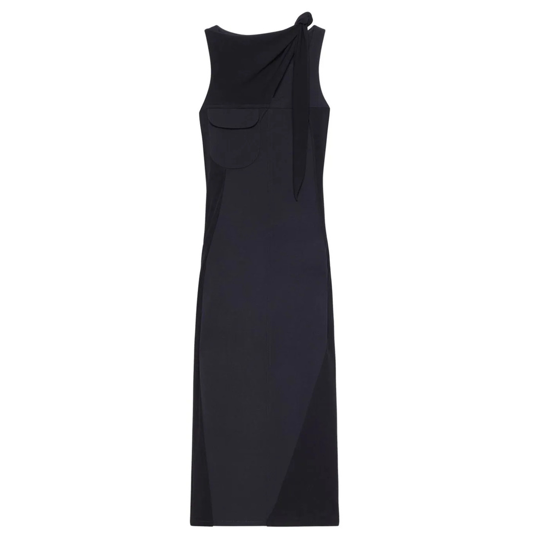 300043811BLK-38 / A4424CRO524WO0113/00/9999 - Distinctive knotted shoulder detail - Sleeveless design - Chest patch pocket - Midi length - Premium wool construction - Fitted silhouette - Back zip closure The Courreges Knot Tailored Wool Long Dress delivers sophisticated minimalism with architectural detailing and premium construction. Crafted from luxurious wool in deep navy, featuring a distinctive knotted shoulder detail and chest pocket for modern elegance. The sleeveless silhouette and midi length create a versatile piece that embodies the brand's refined Parisian aesthetic.
