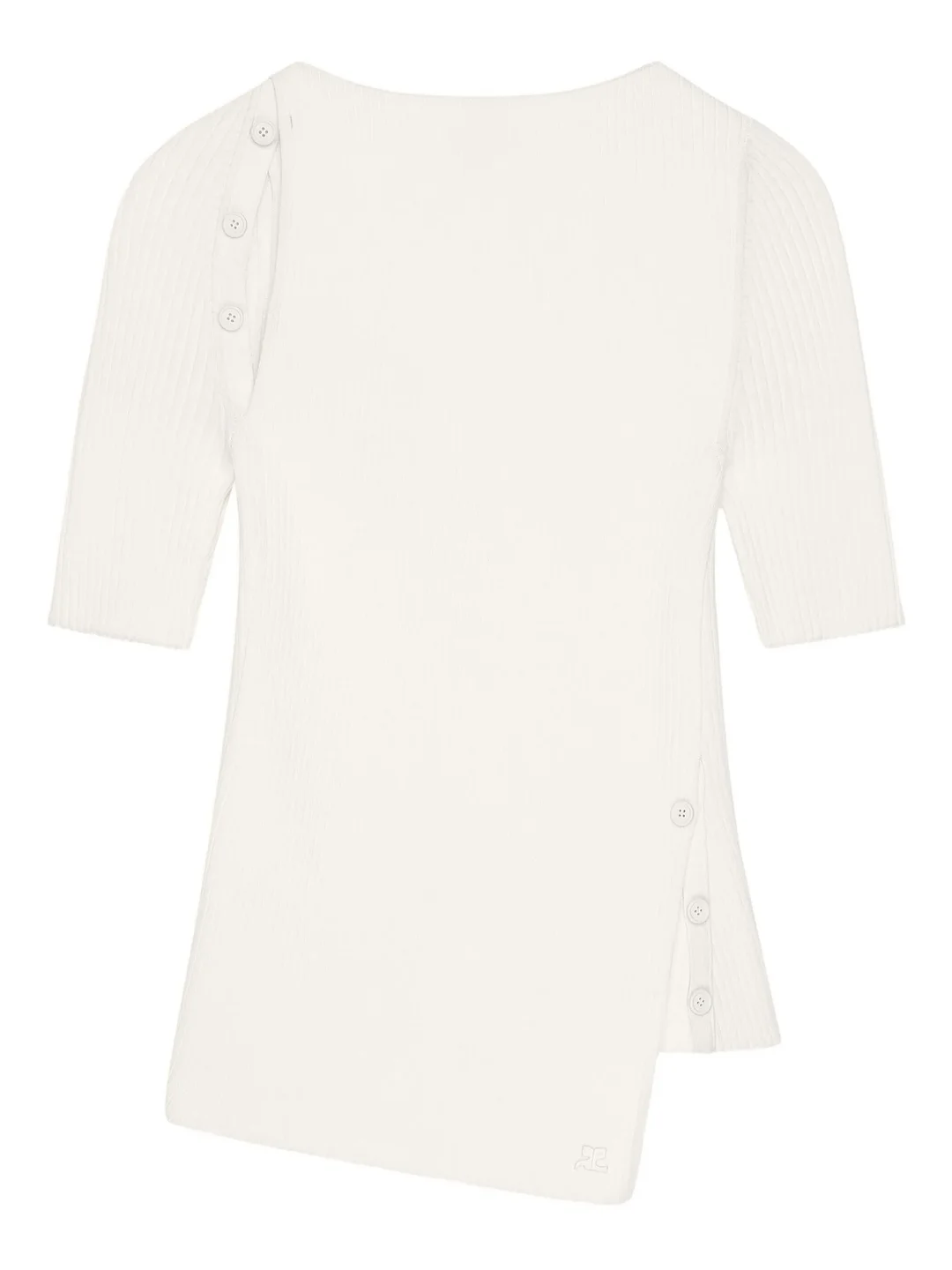 The Courreges Oblique Buttoned Top delivers French avant-garde design with architectural construction and modern sophistication. Crafted from premium cotton in clean white, featuring the brand's signature geometric silhouette with asymmetrical button placement. The structured fit and minimalist aesthetic create a statement piece that embodies Courreges' futuristic vision.