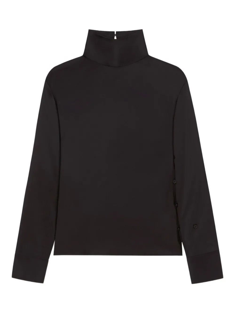 courreges Off-Shoulder Satin Top Satin mockneck top with adjustable asymmetric sleeve.