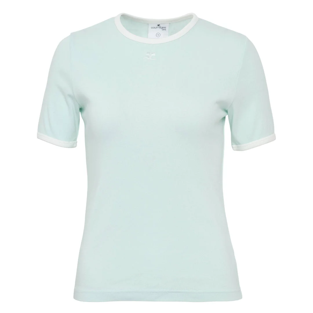 600079346LBL00L / 125JTS017JS0203/00/B216 - Contrast white trim at neckline and sleeves - Short sleeves with rolled cuffs - Subtle logo embossing - Premium cotton construction - Regular fit - Crew neck design The Courreges Signature Contrast T-Shirt delivers futuristic minimalism with the brand's signature space-age aesthetic. Crafted from premium soft cotton in fresh mint green with crisp white contrast trim detailing at the neckline and sleeves. The clean silhouette and subtle logo embossing create a refined piece that embodies Courreges' modernist design philosophy.