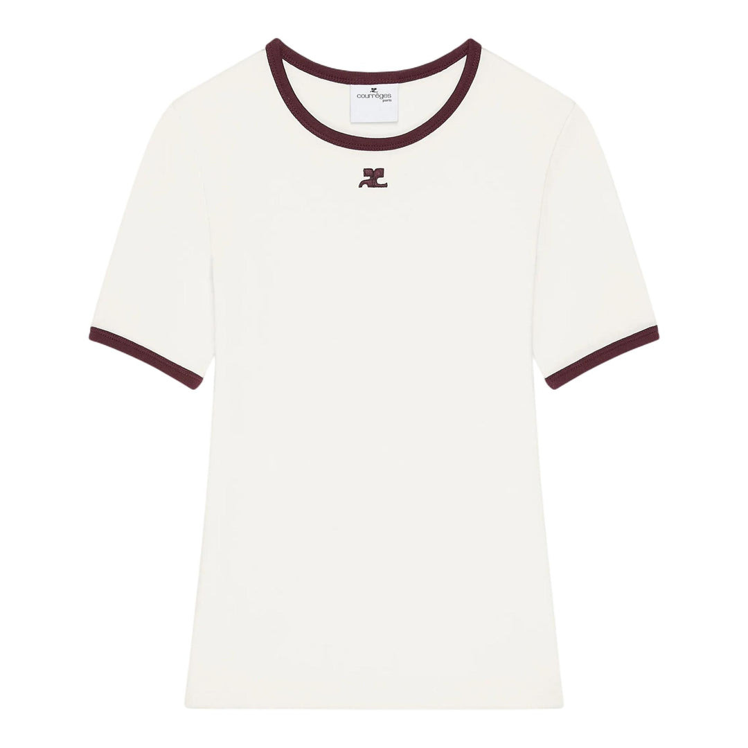 600075044WHT0XS / AW25-125JTS017JS0203/00/B211 - Contrast burgundy trim at neckline and sleeve cuffs - Embroidered Courreges logo at chest - Short sleeves - Crew neckline - Soft cotton jersey construction - Regular fit - Off-white base color The Courreges Signature Contrast T-Shirt delivers modern French elegance with distinctive architectural details and premium construction. Crafted from soft cotton jersey in crisp off-white with contrasting burgundy trim at the neckline and sleeves, featuring the iconic Courreges logo emblem. The clean silhouette and signature contrast piping create a refined statement piece that embodies the brand's futuristic heritage.