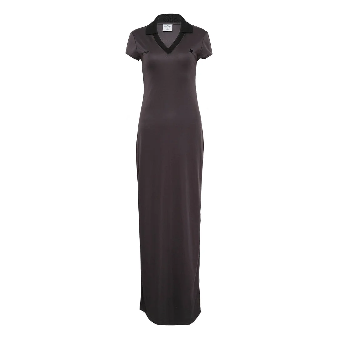 600079364BRN00M / 126JRO807JS0195/00/B214 - V-neck collar with contrast black trim - Short sleeves - Maxi length silhouette - Side seam construction - Technical fabric blend - Fitted bodice with flowing skirt - Signature Courreges logo detail The Courreges Sports Polo Long Dress delivers modern athletic elegance with sophisticated minimalist design. Crafted from premium technical fabric in charcoal gray, featuring the brand's signature V-neck collar with contrasting black trim. The streamlined silhouette and maxi length create effortless versatility for contemporary urban styling.