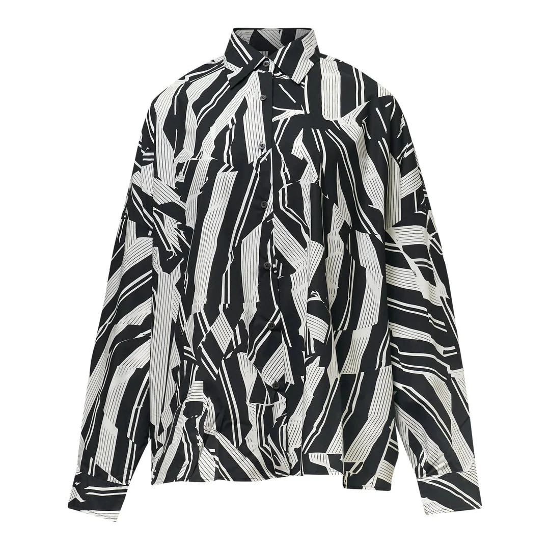 600078587BLK0XS / CASIA/3003/900 - Abstract crushed stripe print - Classic point collar - Long sleeves with button cuffs - Front button placket - Premium cotton construction - Relaxed fit - Monochromatic color palette The Dries Van Noten Crushed Stripe Print Cotton Shirt delivers avant-garde sophistication with architectural pattern work and Belgian craftsmanship. Crafted from premium cotton featuring an abstract crushed stripe print in monochromatic black and white, creating visual depth through geometric distortion. The structured silhouette and signature Van Noten artistic print technique elevate contemporary wardrobes with conceptual design.